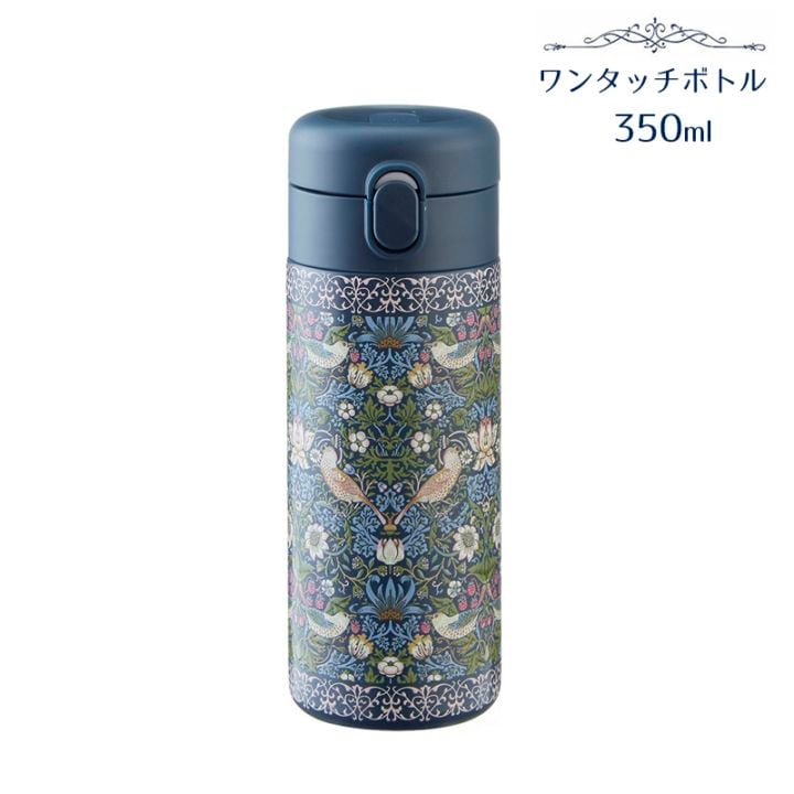ワンタッチボトル 350ml バード&ストロベリーエンボス加工 モリス柄 コンパクト ステンレスボトル 保温 保冷 軽量 水筒 片手開閉 おしゃれ 北欧風 花柄 ギフトRE23140