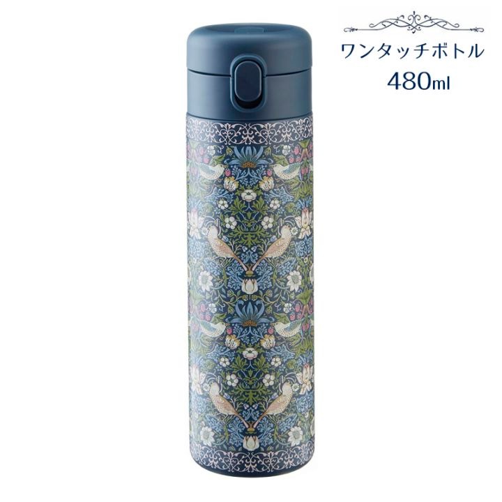 ワンタッチボトル 480ml バード&ストロベリーエンボス加工 柄 ステンレスボトル 保温 保冷 軽量 大容量 水筒 片手開閉 おしゃれ 北欧風 モリス柄 ギフトRE23142
