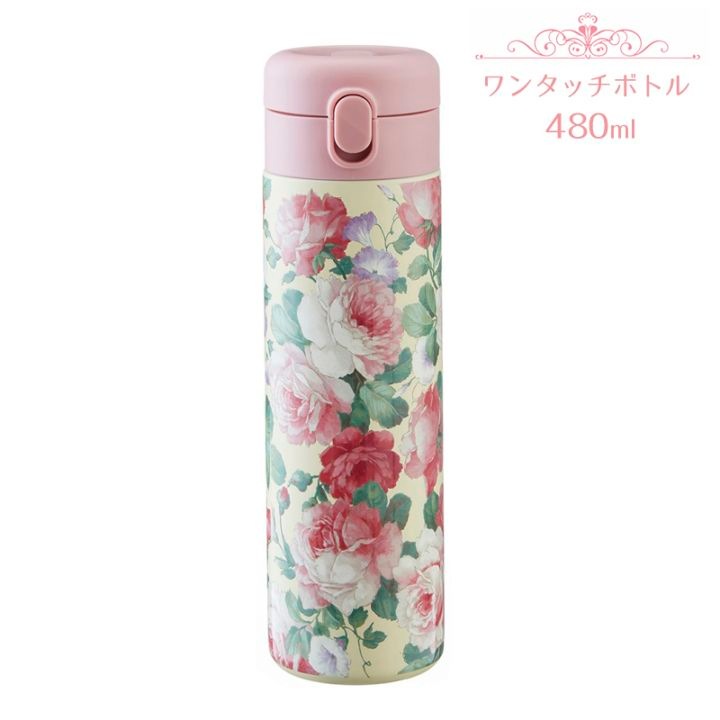 ワンタッチボトル 480ml プリンスローズエンボス加工 ローズ バラ 柄 ステンレスボトル 保温 保冷 軽量 大容量 水筒 片手開閉 おしゃれ かわいい ギフトRE23143