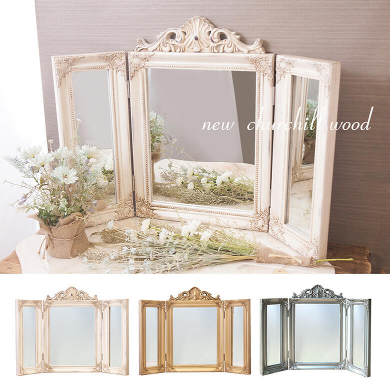 イタリア製 三面鏡 アンティークホワイト×ゴールド