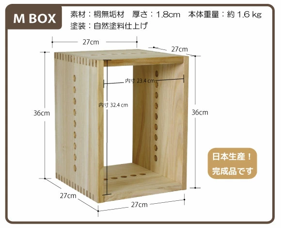 6個以上ご購入で接続穴なしにも対応可能です。その場合、受注生産となりますので納期約4週間かかります。(接続穴なしの場合ジョイント金具は付属しません) 自然オイル塗料を使用し木目を生かした手作業塗装で仕上げた桐材キューブボックス |