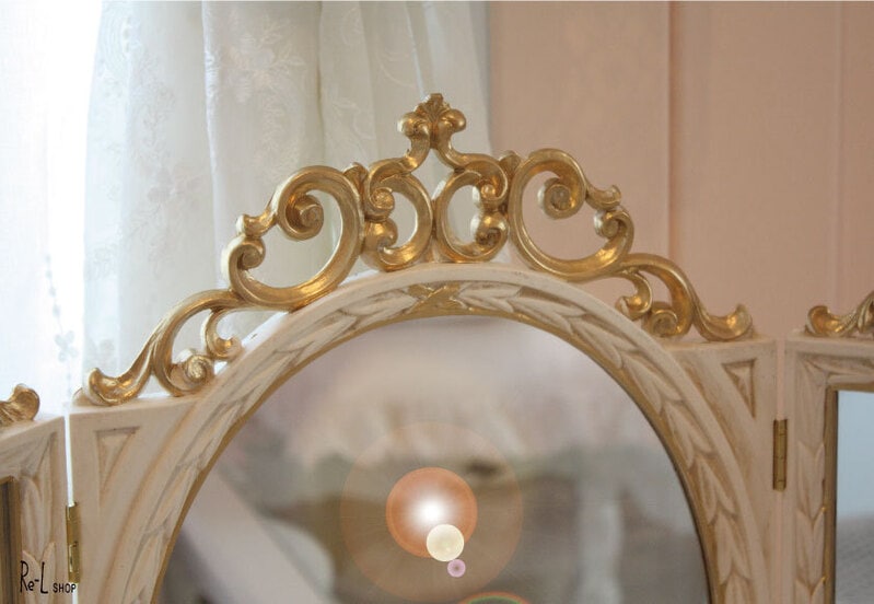 | イタリア製のエレガントな折りたたみ三面鏡。 ハンドメイドで仕上げられたアンティーク調の装飾がとても味わい深く、美しい仕上がりです。 気どりすぎない落ち着いたデザインは、様々なジャンルのインテリアにマッチします。 |