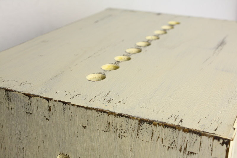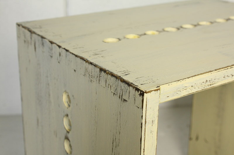 アンティーク剥がし加工をなしにする対応が可能になりました。アンティークテイストはそのままに下地のダーク色が見えないホワイトの仕上がりとなります。追加費用なし。 メインカラー、下地、表面コーティングと3種類の塗料を使用しペイント方法と手作業により長年使い込んだような独特のアンティーク感を再現しました。 |