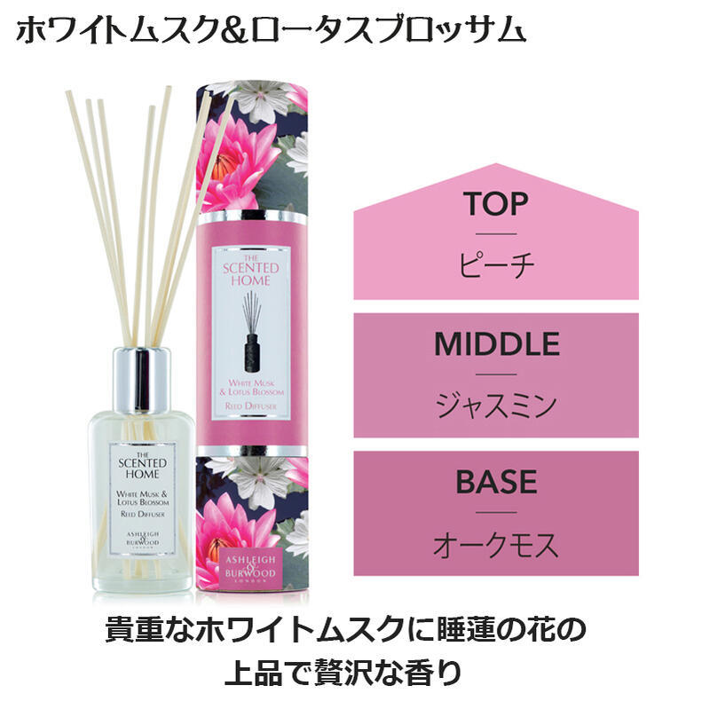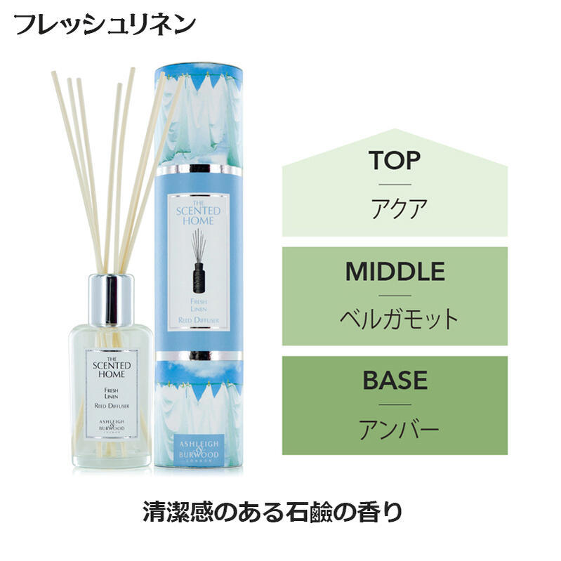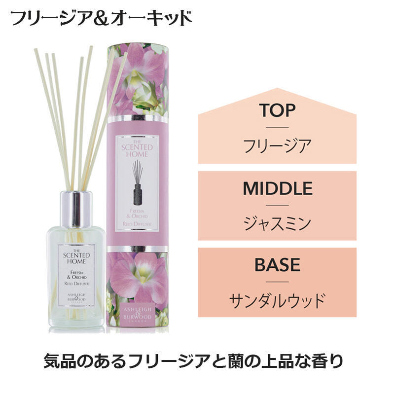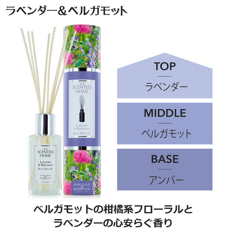 | 英国アシュレイ&バーウッドのリードディフューザー。 こちらはブレンド数が少ない【The Scented Home】シリーズで、初心者でも使いやすいシンプルな香りが特徴です。 上質な香りはもちろんのこと、見た目やパッケージもお洒落なのでインテリアアイテムとしても優秀です。 芳香期間も約3ヶ月と、香りを長くお楽しみいただけるのもポイントです。 |