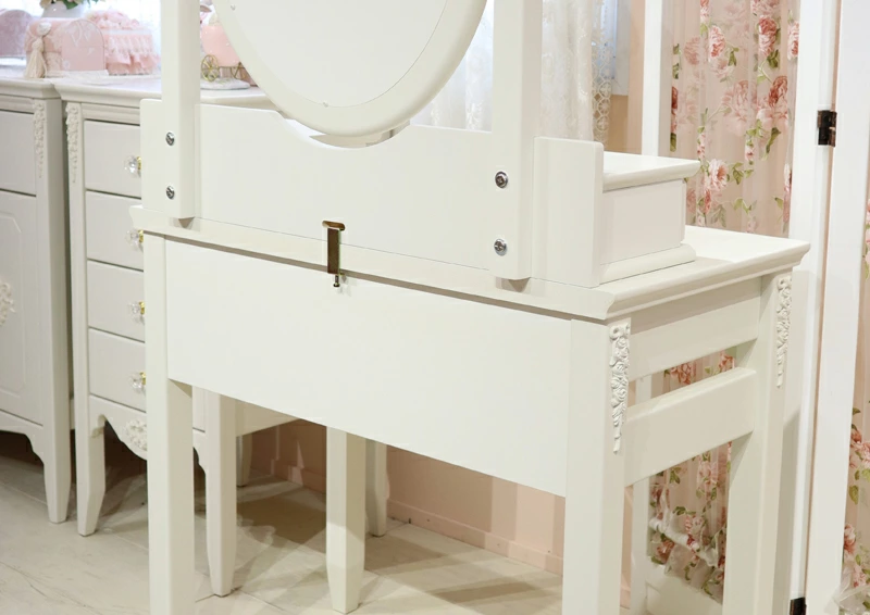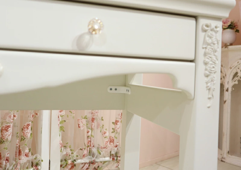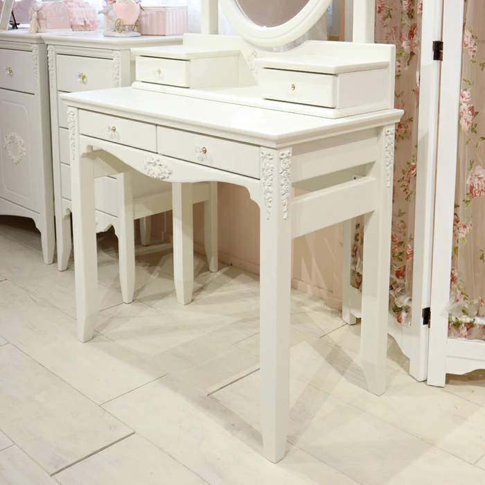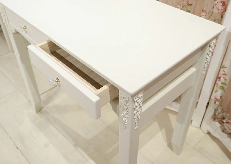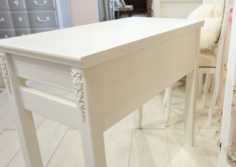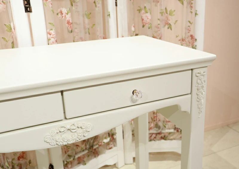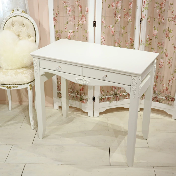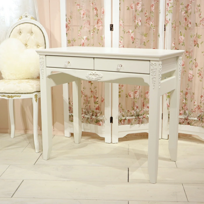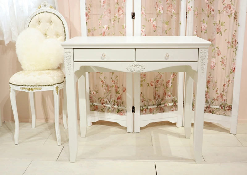 | オリジナルデザインのローズ飾りと、優しく包み込まれるような上品なホワイトカラーが特徴の白家具【チェレスタ】シリーズ。 デスク単品でのご利用はもちろん、同じシリーズの置きミラーやスツールと組み合わせてドレッサーとしてもご利用いただけます。 ※日本の自社工場で製造しており受注生産品となります。塗装から仕上げまで職人による手作業のため納期は約2週間~約4週間程度いただいております。 |