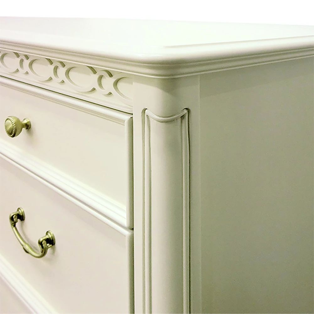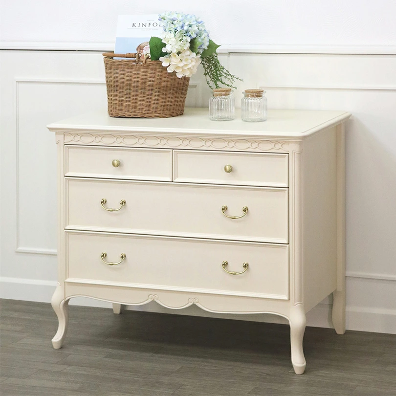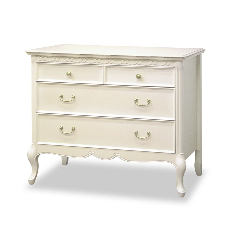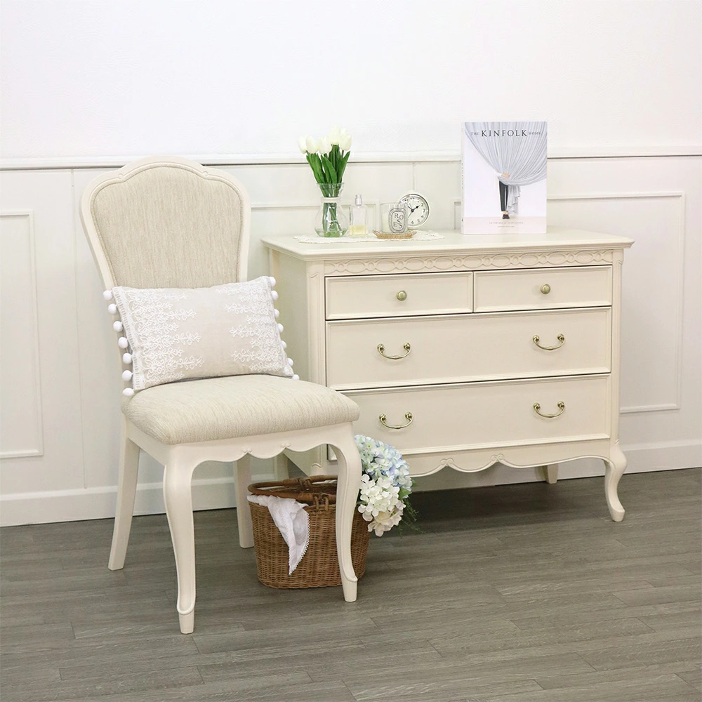 | ロココ調フレンチカントリー家具『フルール』シリーズ。 丸みを帯びた優美なラインと、エレガンスの代名詞ともいえるカブリオールレッグ(猫脚)が特徴です。 木肌が薄っすら残る上品な色合いで仕上げられており、フェミニン・ガーリー・ロマンティック等のエレガンススタイルや、ロココ調コーディネートなど、優しい気分になれるようなインテリア空間を作り出してくれます。 |