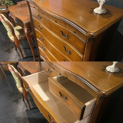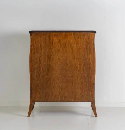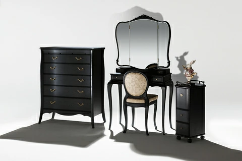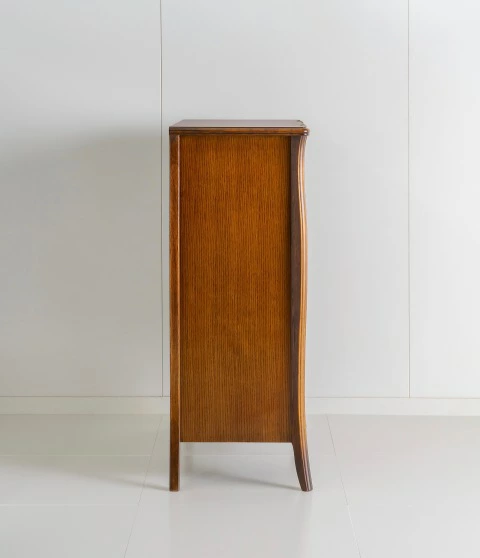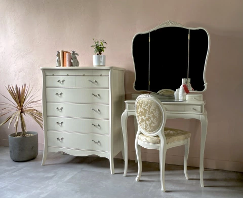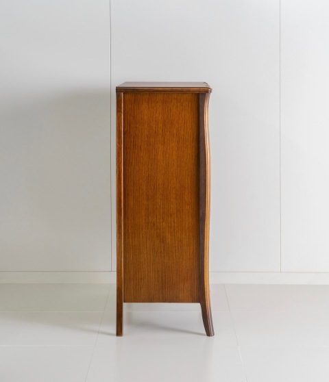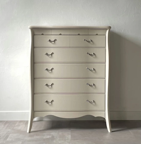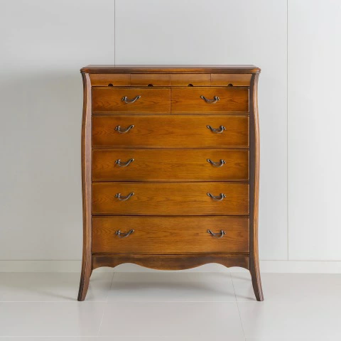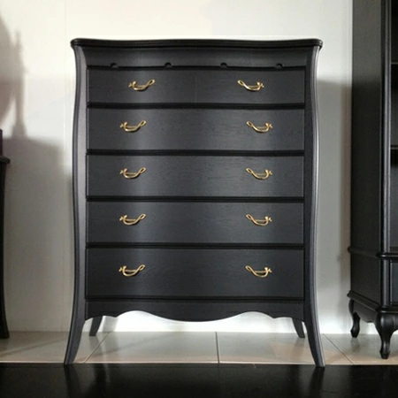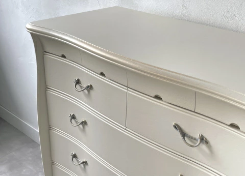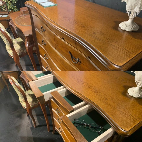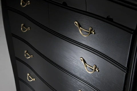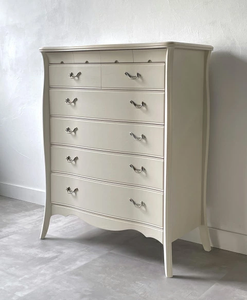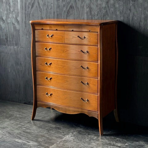| 国産高級家具【Continue】カンティーニュシリーズのハイチェスト。 彫刻はデザイナーが描く繊細なラインを職人が丁寧に彫り込んで表情を造り上げています。上部4杯の小引き出しの底は布貼りになっています。 その他にもジョイントを強力にする手の込んだフィンガージョイント工法や、取っ手部分のお洒落なシャルマンハンドルなど、こだわりの技の1つ1つでカンティーニュのエレガンスの表情は造られています。 |