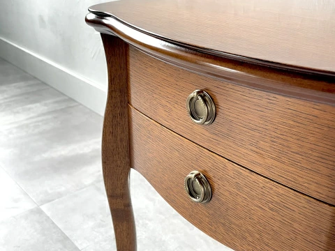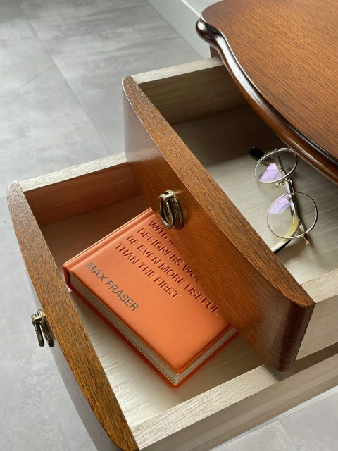 | 国産高級家具【Continue】カンティーニュシリーズ。 優雅な曲線美が印象的なナイトテーブルです。 彫刻はデザイナーが描く繊細なラインを職人が丁寧に彫り込んで表情を造り上げています。 猫脚部分なども無垢材で大胆に表現されており、普段の生活シーンを贅沢な空間に演出するアイテムです。 |