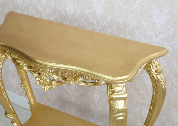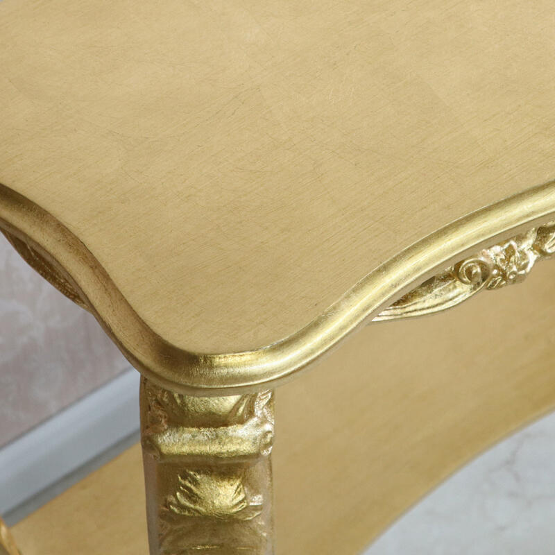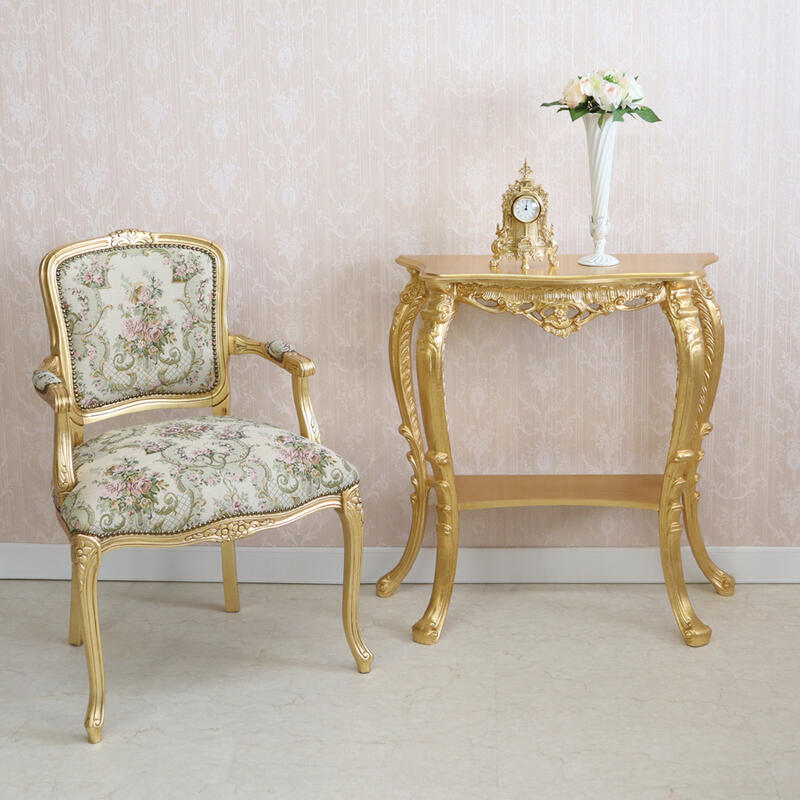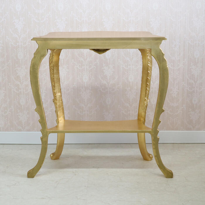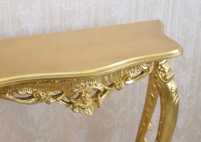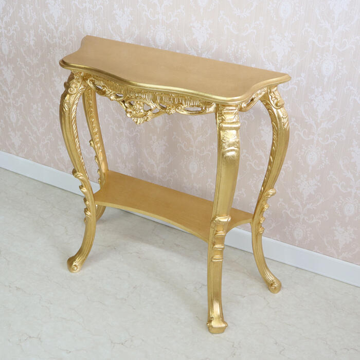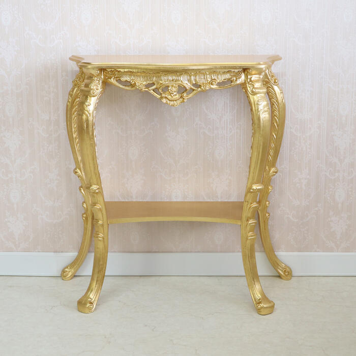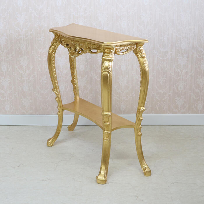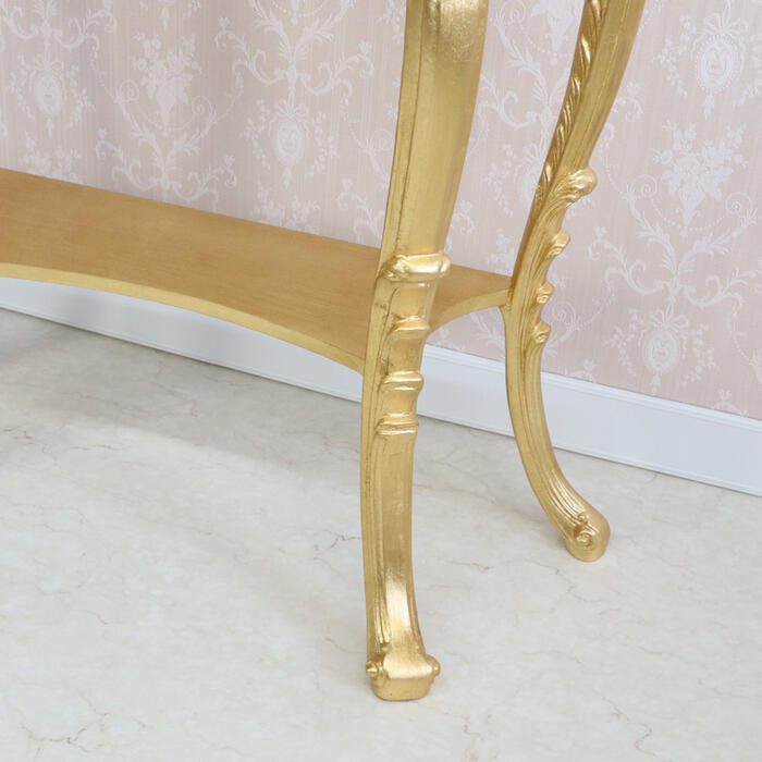| アンティークゴールドのイタリア製コンソール。 熟練職人の手仕事による金箔風シート貼りと繊細な彫刻が、とても華やかな仕上がりです。 イタリアンクラシックの流麗なフォルムが格調高い空間を演出します。 |