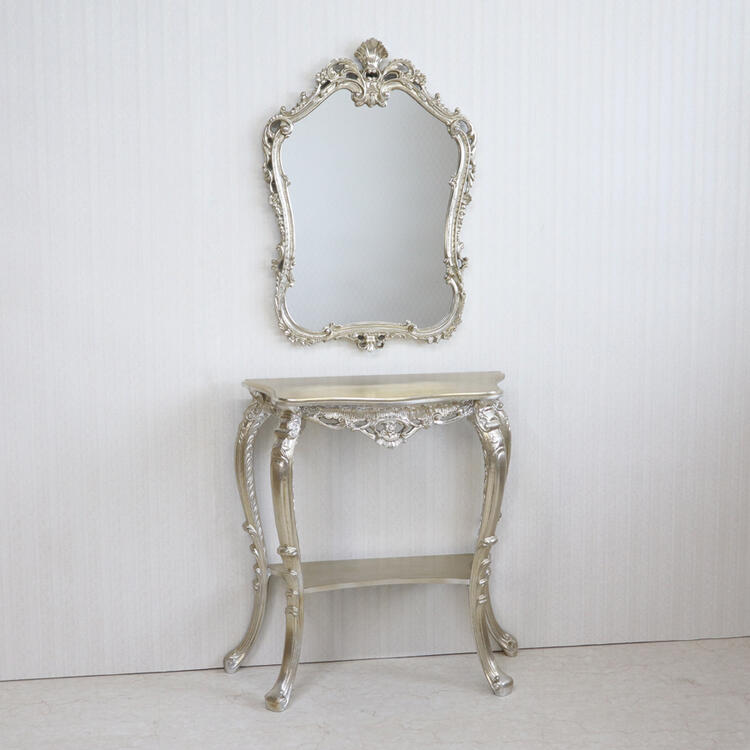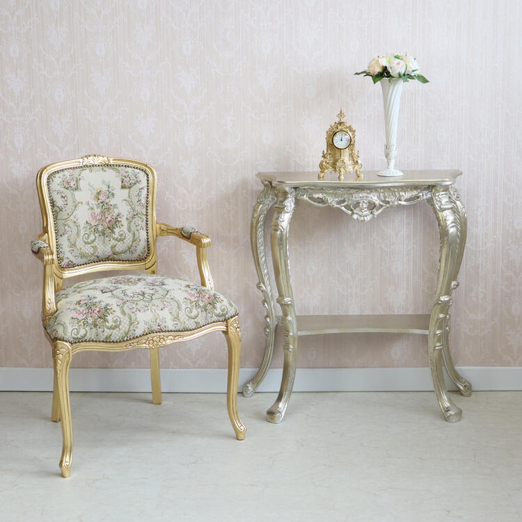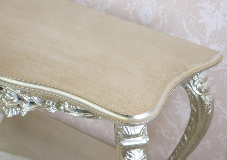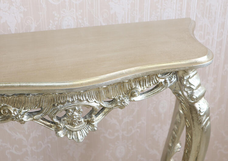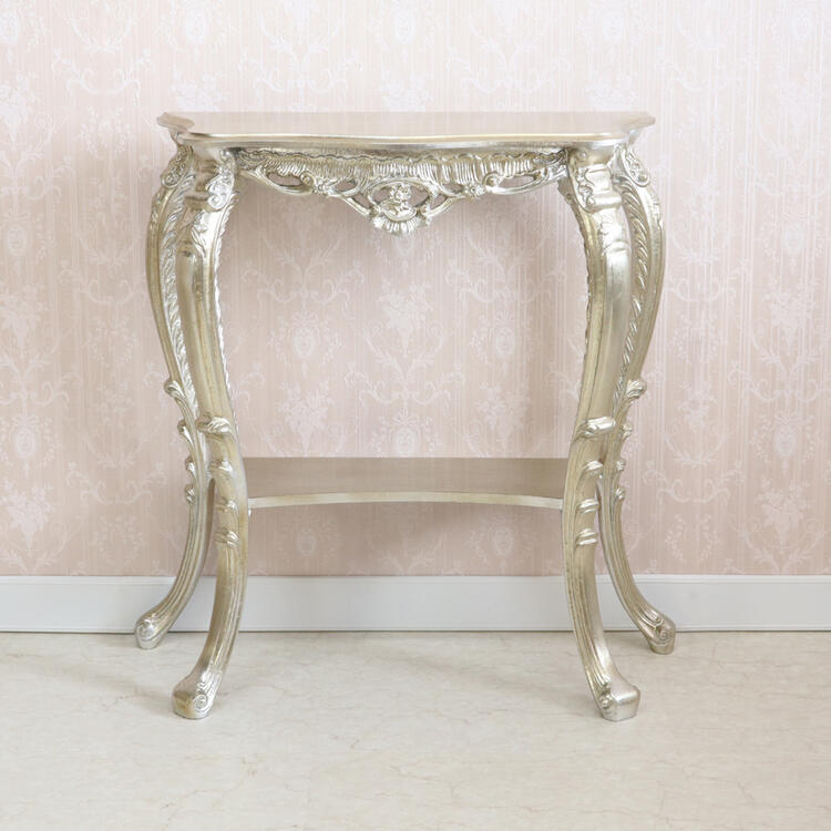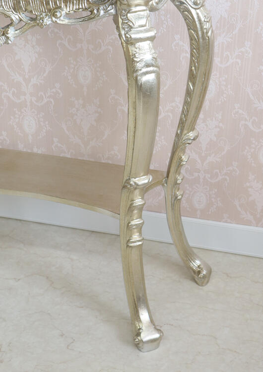 | アンティークシルバーのイタリア製コンソール。 熟練職人の手仕事による銀箔風シート貼りと繊細な彫刻が、とても華やかな仕上がりです。 イタリアンクラシックの流麗なフォルムが格調高い空間を演出します。 |