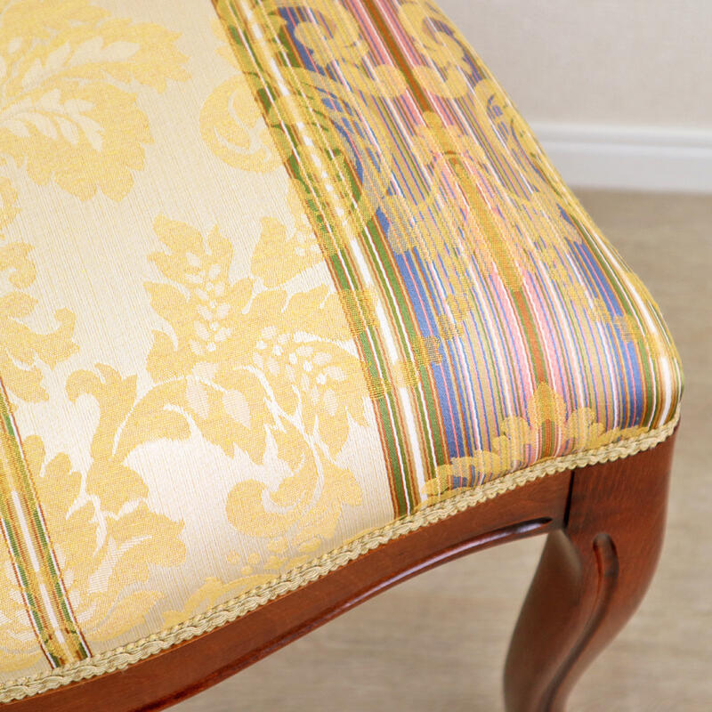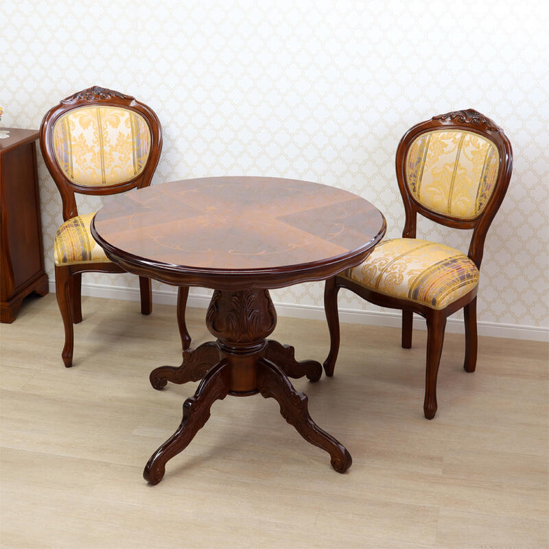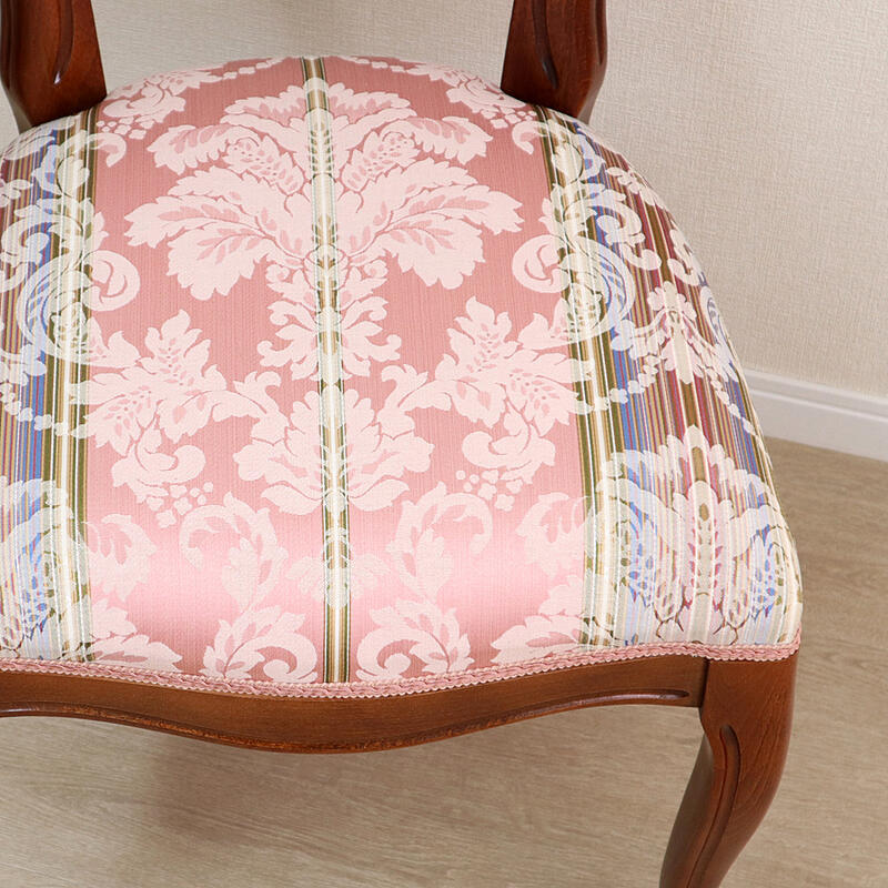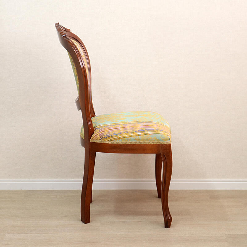 | クラシックスタイルのイタリア製ダイニングチェア。 高級感のある色合いの生地に、伝統のカービングフレームと猫脚が特徴です。 イタリアの熟練職人によるハンドメイド家具で、優雅で魅力的なデザインがインテリア空間を華やかにしてくれます。 |