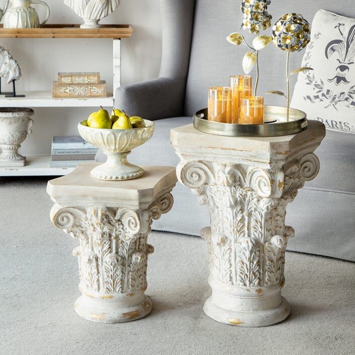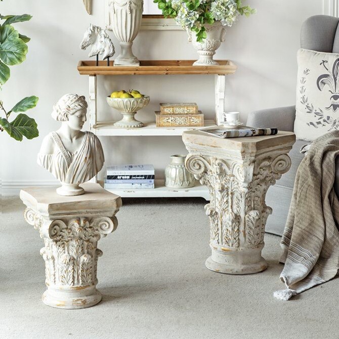 | ローマコラムをモチーフにしたお洒落なサイドテーブル。 細やかな彫刻、立体感ある装飾、上品なシャビー加工が、まるで海外インテリアのワンシーンのような雰囲気を演出します。 天板部分はフラットで安定感があり、花瓶やキャンドル、フォトフレームなどを飾るディスプレイ台としても最適。 クラシック、シャビーシックインテリアとの相性も抜群です。 |