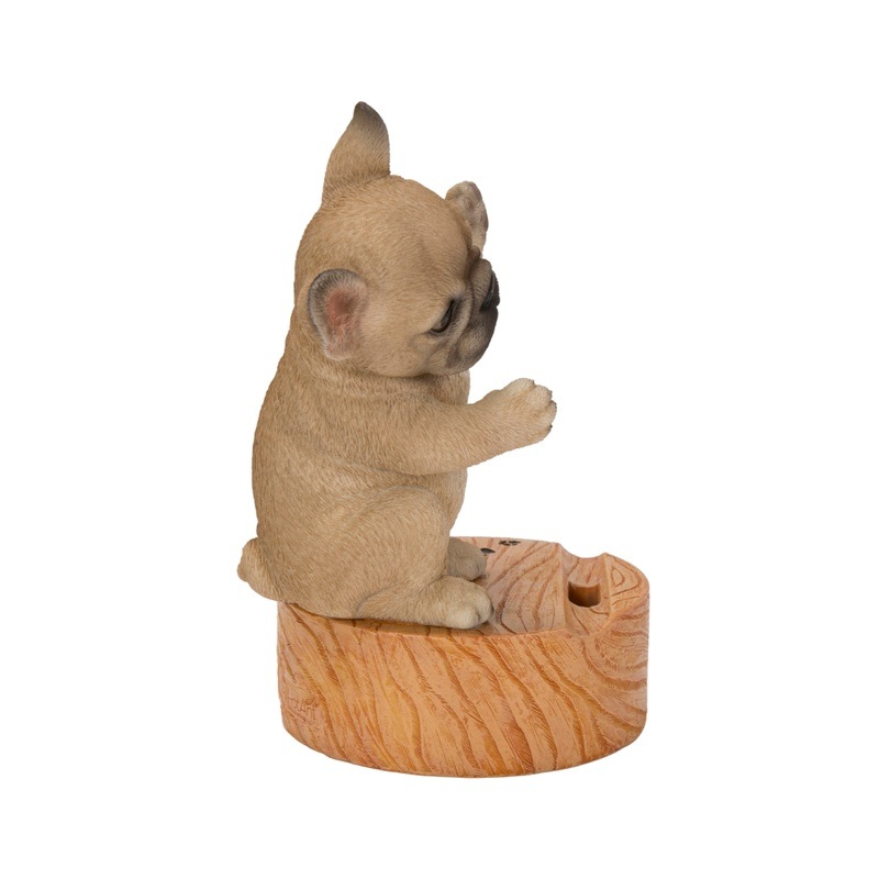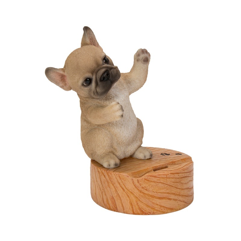 | 手を伸ばした姿が可愛らしいフレンチブルドッグのスマホスタンド。 スマートフォンを立てると、ひょっこり顔を出しているようなデザインで、デスクや棚に置くだけで癒しの存在感を放ちます。 ナチュラルな木目調の台座と、繊細に表現された表情や毛並みが、インテリア雑貨としても楽しめる仕上がり。 背面には充電コードを通せる穴(溝)があり、スマートフォンを立てたまま充電が可能です。 動画視聴や通知チェック、デスクワーク中の定位置としても使いやすく、見た目の可愛さと実用性を兼ね備えています。 リビングやデスク周りはもちろん、玄関やベッドサイドに置いても可愛く映え、犬好きな方へのギフトにもおすすめです。 |