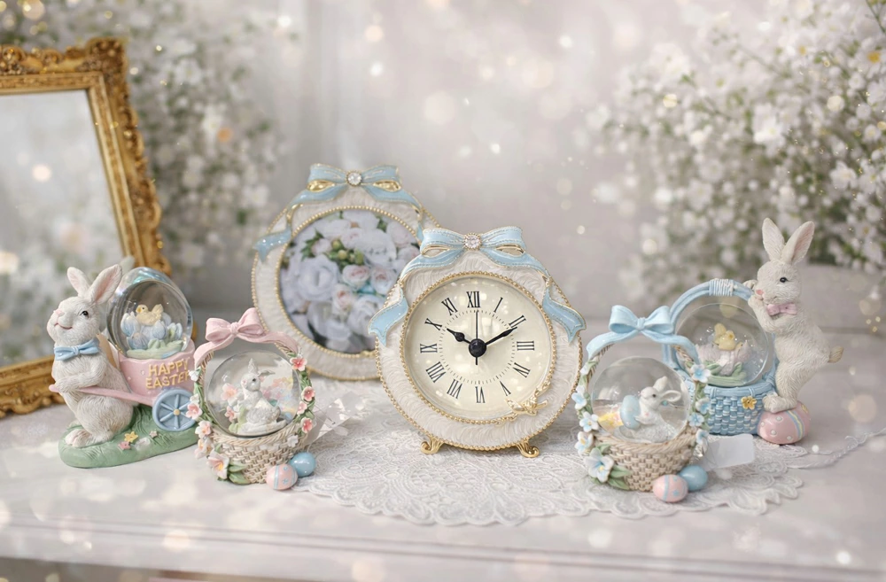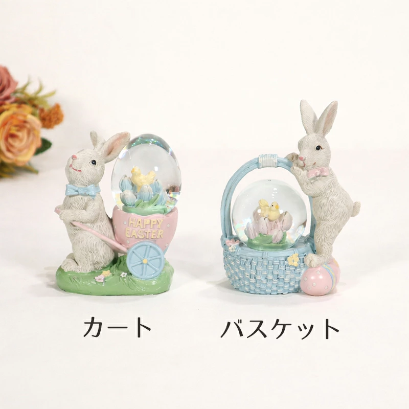 | イースター気分をぎゅっと詰め込んだ、うさぎモチーフのスノードームオブジェ。 ころんとしたガラスドームの中には、花と小鳥が愛らしくデザインされ、春らしいやさしいカラーが空間を明るく演出します。 うさぎが卵やドームに寄り添う姿は、見ているだけでほっこり。玄関や棚、カウンターなどのワンポイントディスプレイにおすすめです。 デザインは ・カートを押すうさぎが可愛らしい「カート」 ・バスケットに寄り添う姿が愛らしい「バスケット」 の2種類をご用意しております。 季節のインテリアとしてはもちろん、ギフトにもぴったりのアイテムです。 |