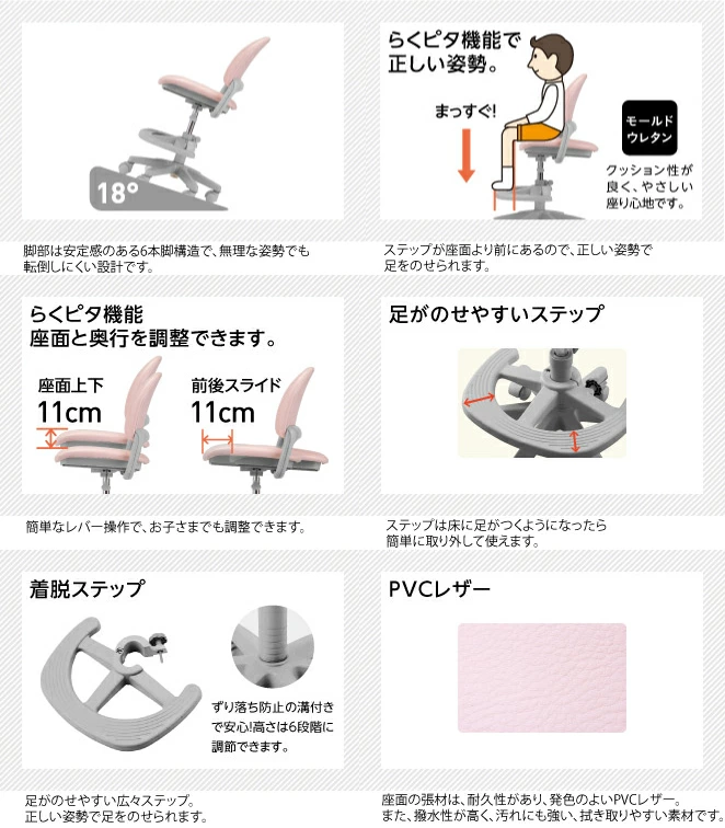 ・背面前後スライド調節(11cm) ・6本脚構造 ・切り替えキャスター チェア材質:PVCレザー、ウレタン、ナイロン |