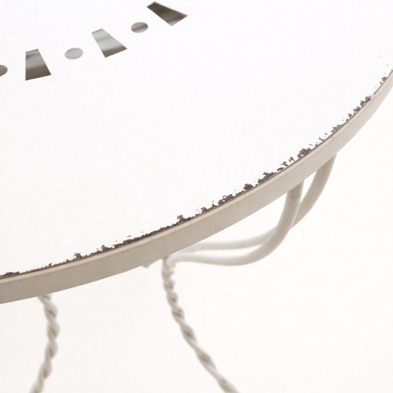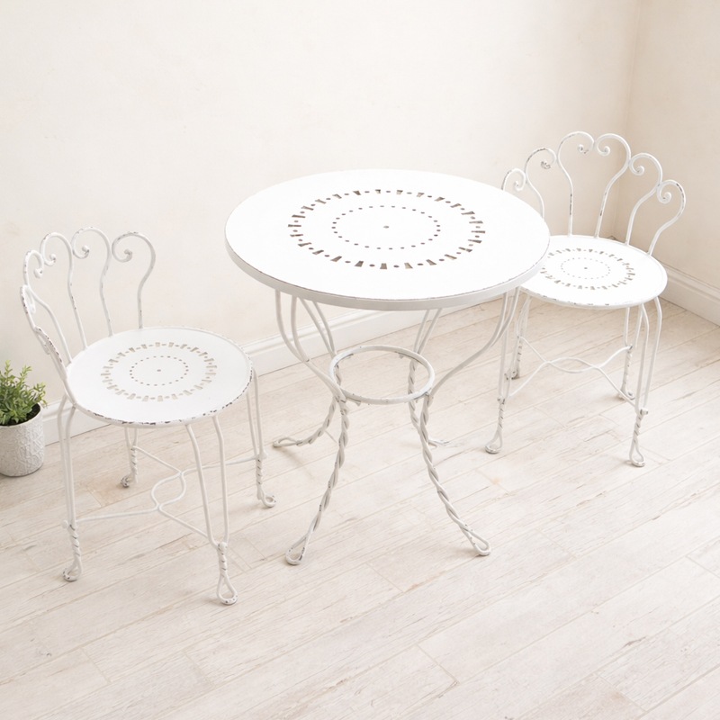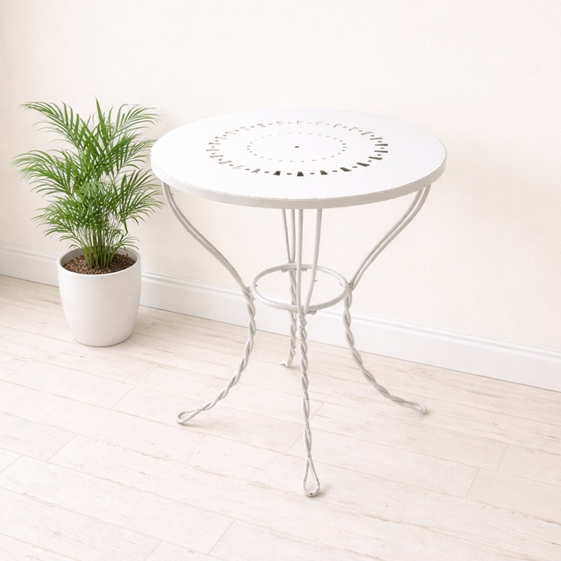 | 繊細な曲線デザインが美しいアイアン製ラウンドテーブル。 アンティーク調のホワイトカラーが、空間を明るく上品に引き立てます。 天板にはさりげない透かしデザインを施し、軽やかで優雅な印象に。 圧迫感を与えにくく、リビングやベランダ、ガーデンスペースにも自然に馴染みます。 脚部はアイアンならではのしっかりとした安定感がありながら、曲線を活かしたデザインで柔らかさもプラス。置くだけで空間のアクセントになる一台です。 |